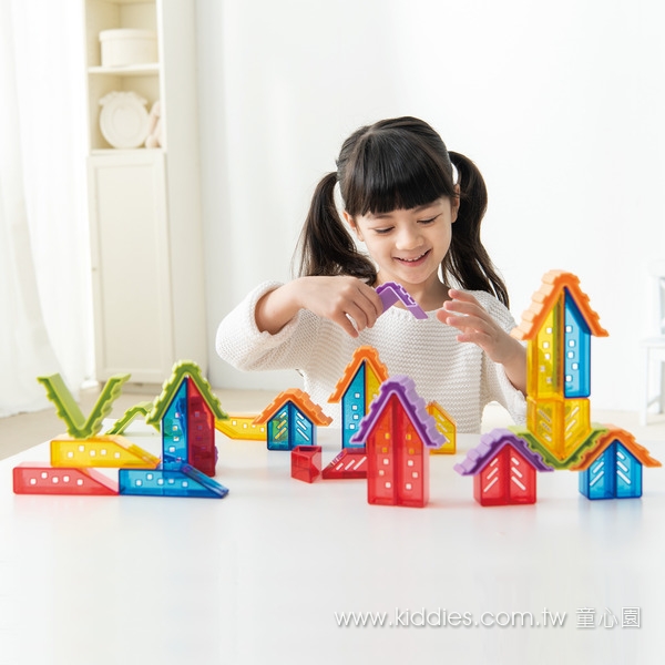- 哇!亮晶晶、傾斜、倒立的房子…這是魔法屋吧!由6棟高房子,6棟矮房子,搭配兩種屋頂角度,不論各種瘋狂組合,都能建構出繽紛又獨特的魔法屋!還能觀察透明與混色的光影變化,或依圖卡進行角度、序列等數學遊戲,多元的功能,百玩不膩!