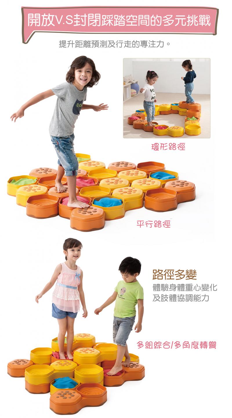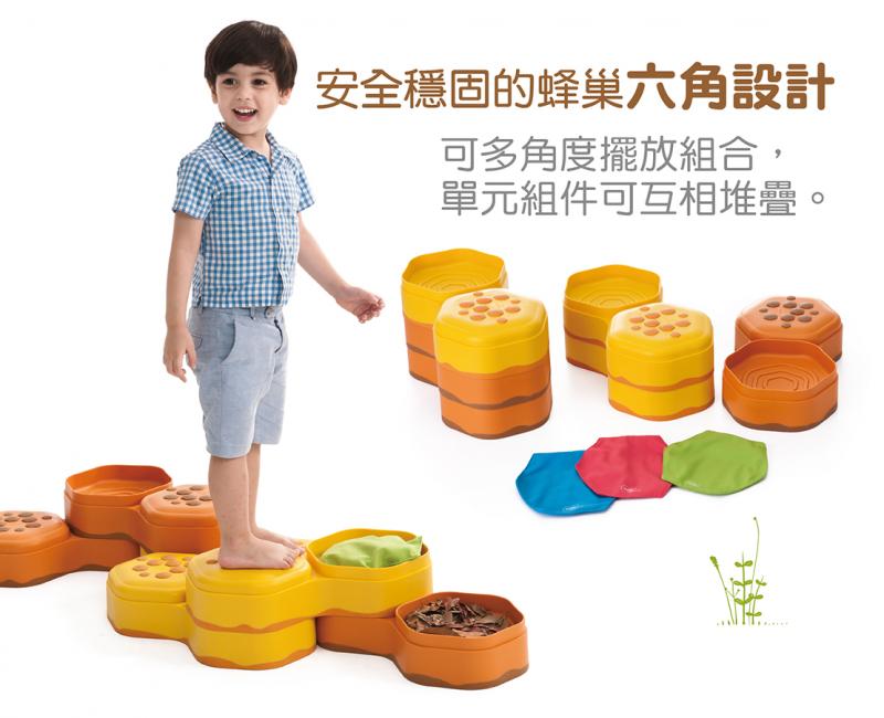 •六角蜂窩造型及一凹一凸的高低對比單元設計,呈現開放式及封閉式的踩踏空間,體驗身體重心變化與行走時的專注能力。