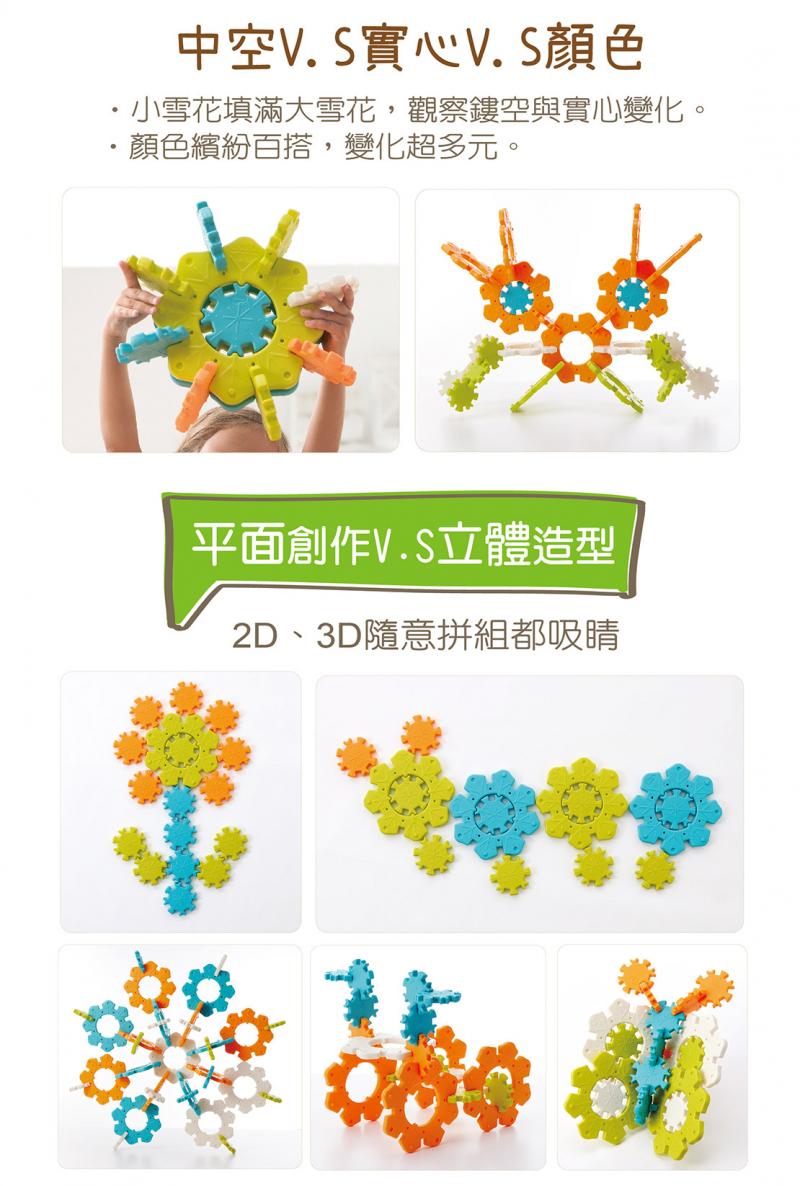 •大小雪花片的設計,可互相卡合,多變的卡合角度,小雪花更可嵌合入大雪花當做圓心,可組出超大造型,讓孩子培養創意建構及圖像思考的能力。