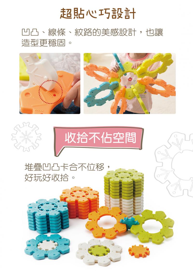 •雪花積木的貼心凹凸紋路設計,疊合收拾不佔空間。