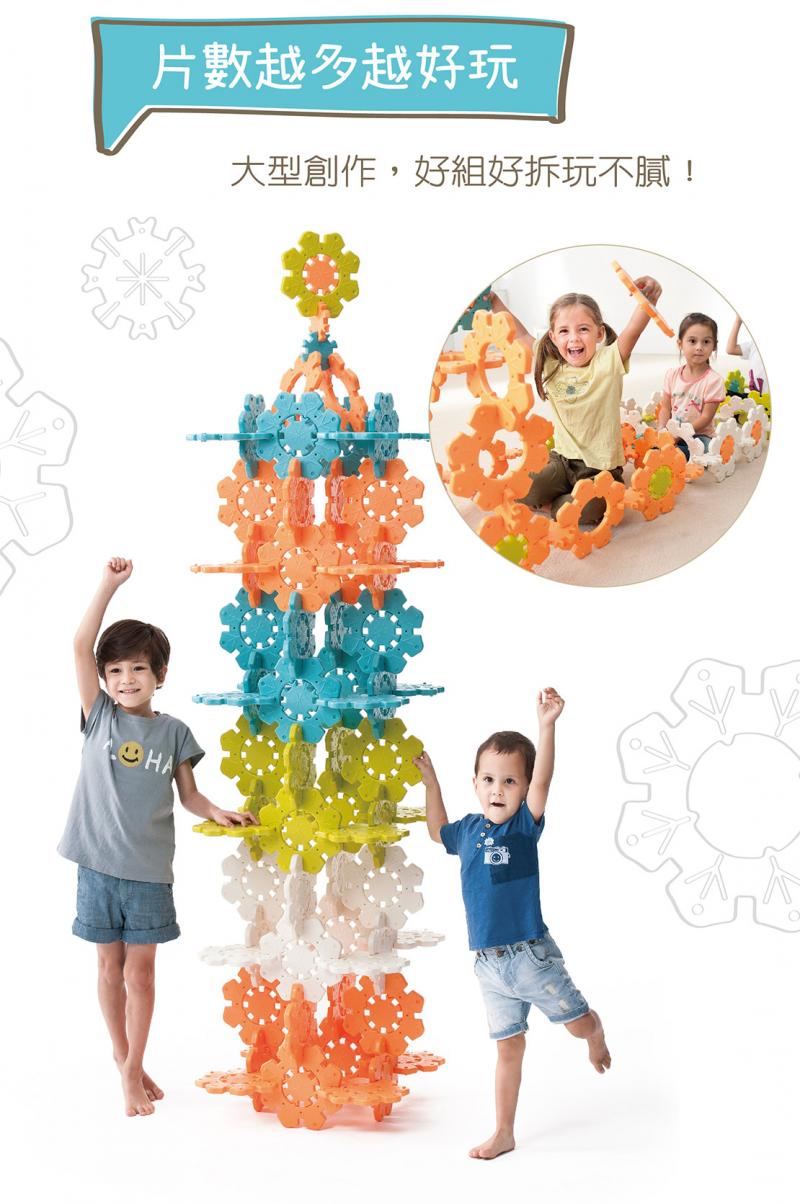 大小雪花片的設計,可互相卡合,多變的卡合角度,小雪花更可嵌合入大雪花當做圓心,可組出超大造型,讓孩子培養創意建構及圖像思考的能力。