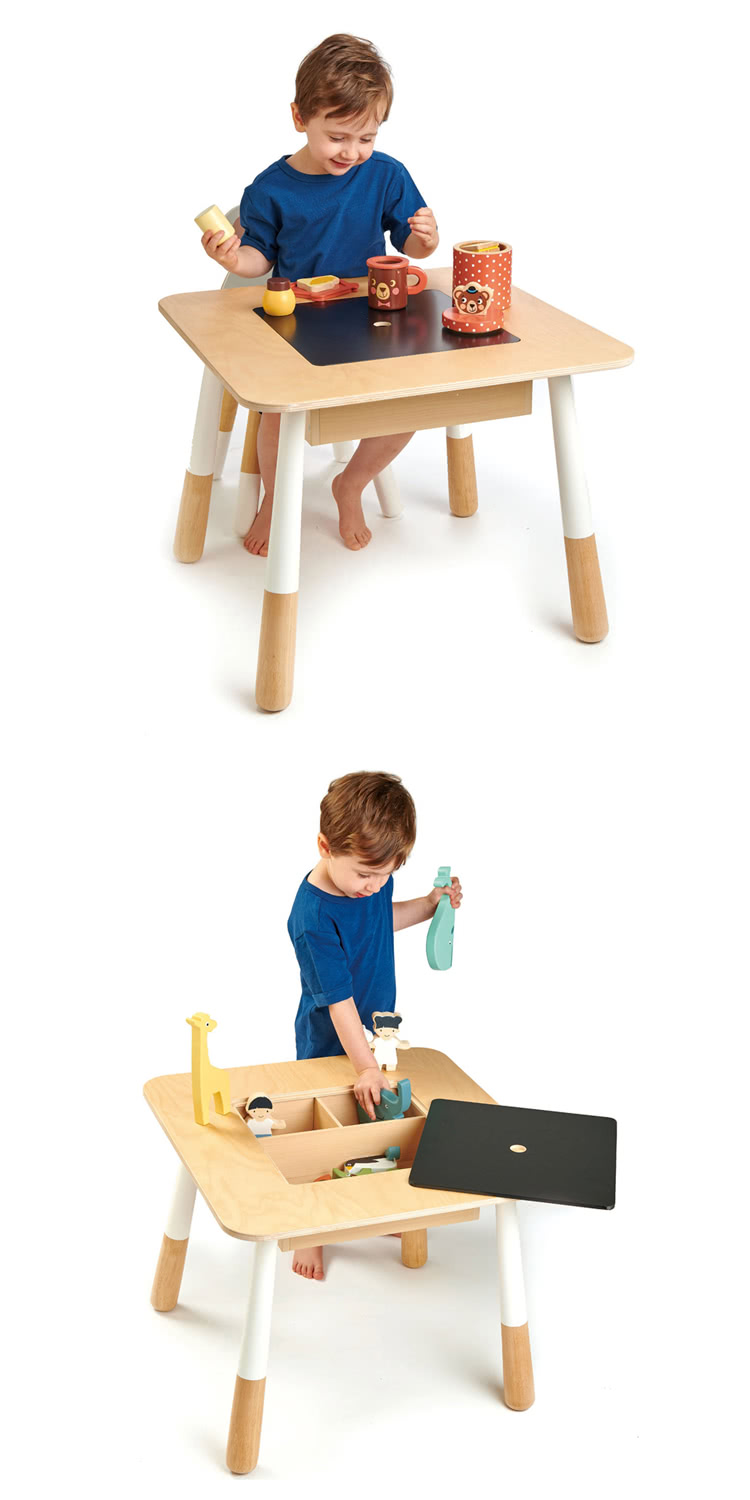 ★ 一個時尚的膠合板桌子,在黑板中央面板下,帶有隱藏隔間。黑板可用蠟筆。