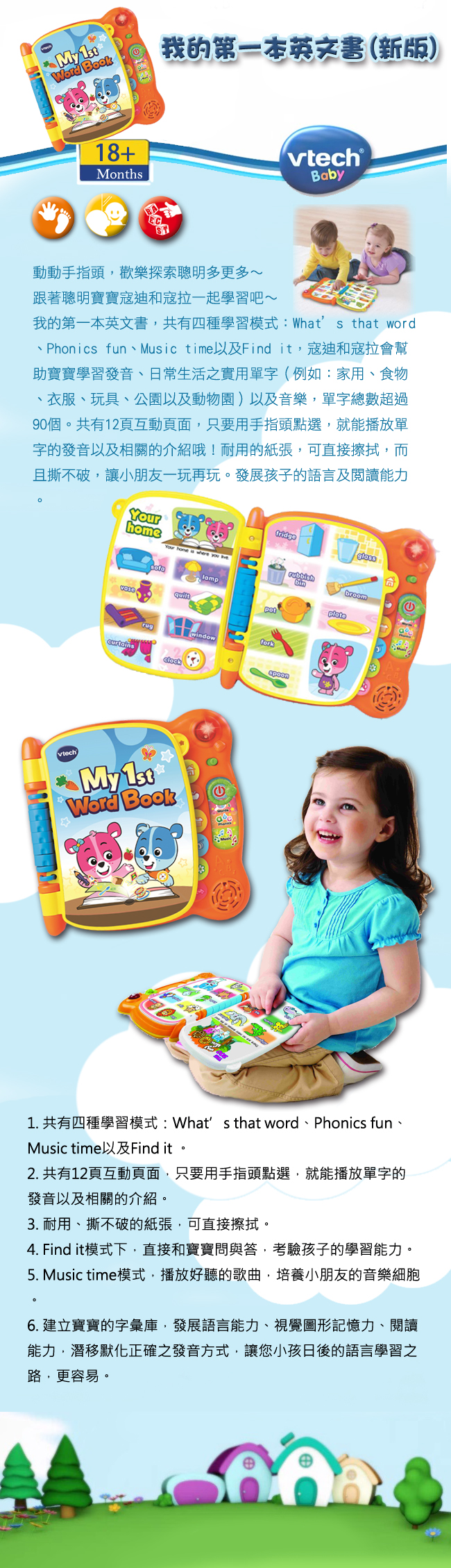 我的第一本英文書,共有四種學習模式 : what's that word、Phonics fun、Music time以及Find it,冠迪和冠拉會幫助寶寶學習發音,日常生活之實用單字(例如 : 家用、食物、衣服、玩具、公園以及動物園)以及音樂,單字總數超過90個。共有12頁互動頁面,只要用手指頭點選,就能撥放單字的發音以及相關的介紹喔~耐用的紙張,可直接擦拭,而且撕不破,讓小朋友一玩再玩。發展孩子的語言及閱讀能力。