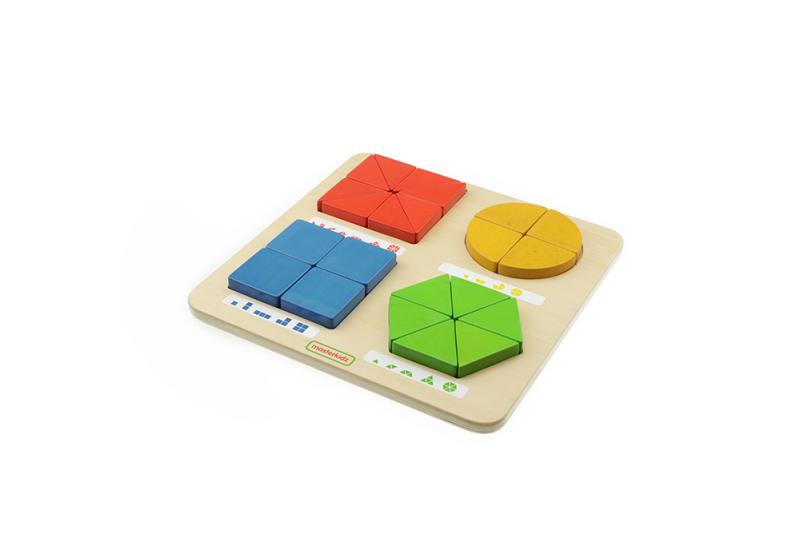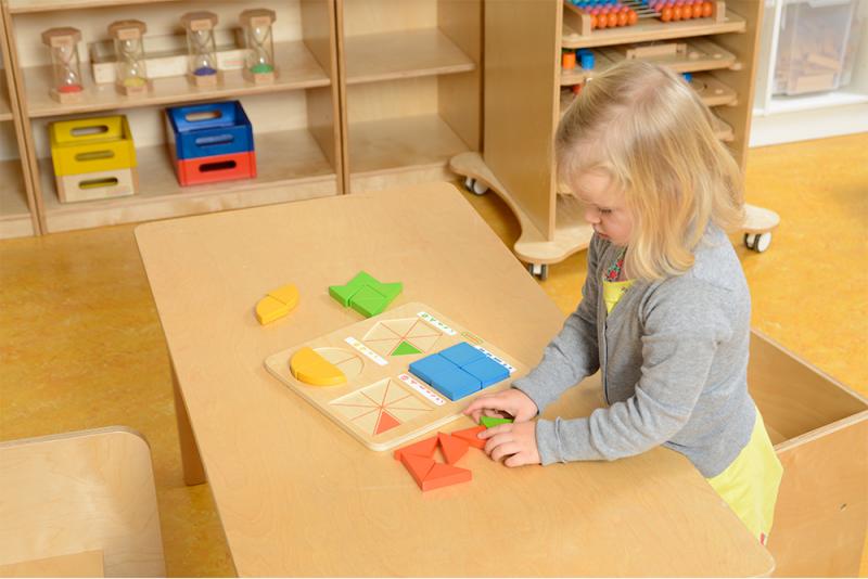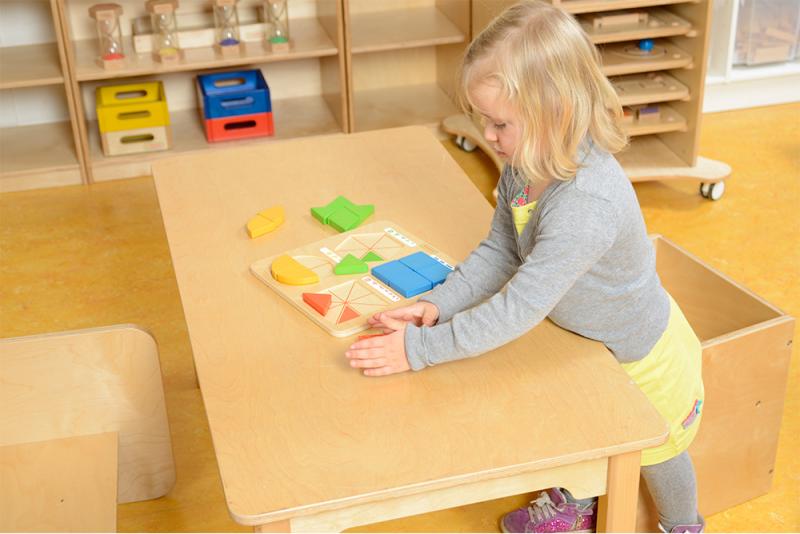 學習板上印有四個幾何圖形切割方式的輪廓線,為幼兒提供了一種行之有效的自檢方法。可以配合板類玩具收納櫃(MK03146)使用。