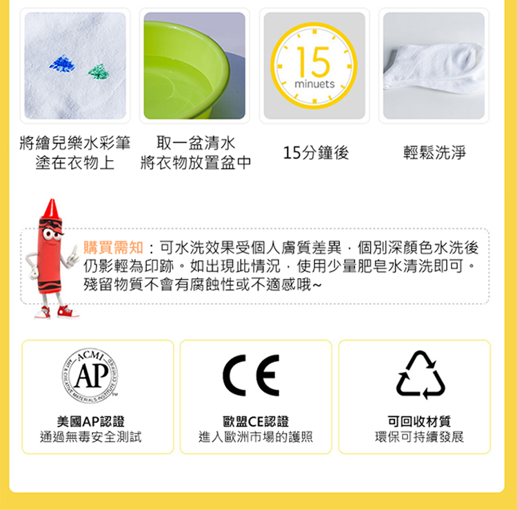 ●可水洗顏料,塗抹於皮膚、衣服、傢俱,可立即以溫水清除洗淨,無需擔憂