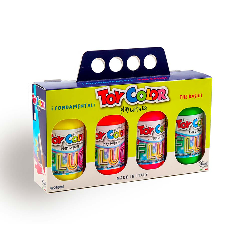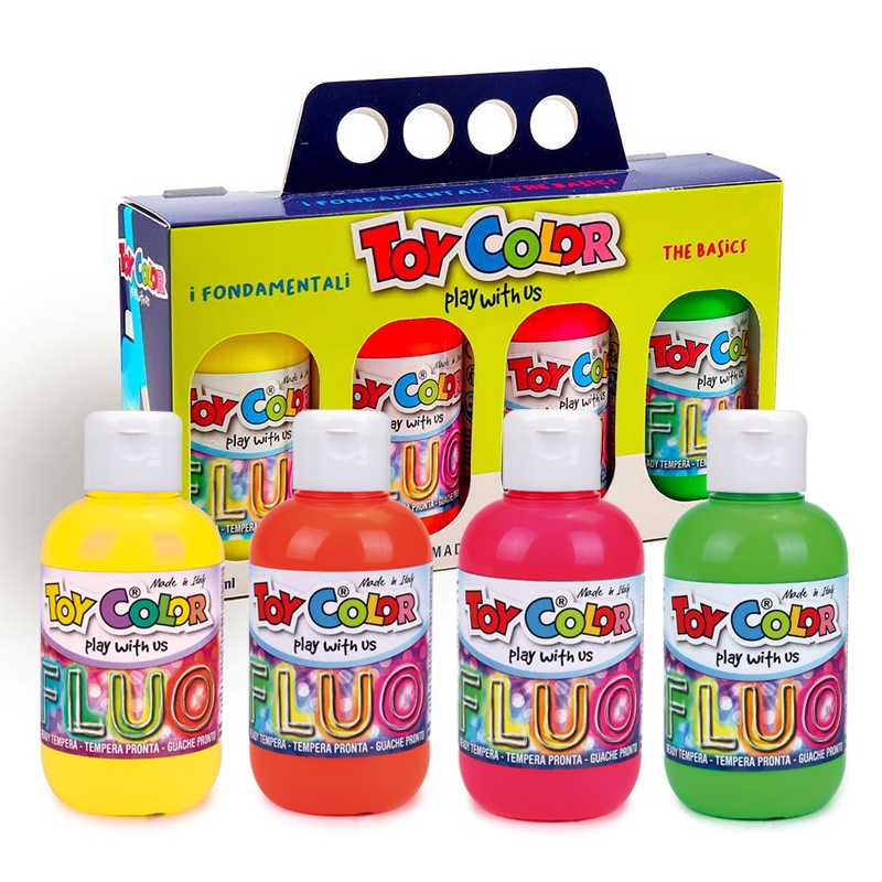 【義大利 TOY COLOR】四色螢光蛋彩兒童顏料組250ML(亮桃/亮黃/亮綠/亮橘)
