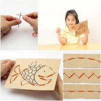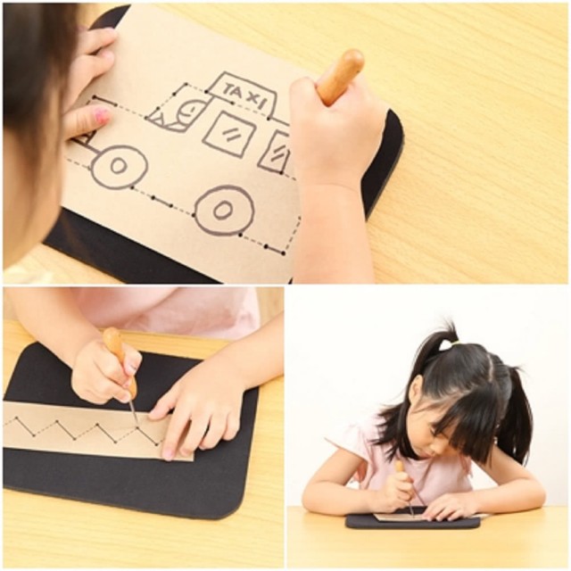 一開始可以從基礎刺工開始,讓孩子將縫工卡放在刺工墊上,抓握刺針沿著卡上的縫點一一刺穿,增進手指的抓握力與穩定度。第二階段,可以讓孩子挑選縫工卡上進行多種縫紉練習,透過縫紉完成各式圖案。