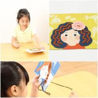除了刺工、縫工,孩子也可以進行穿線遊戲,運用趣味的髮型穿線卡,練習基礎縫工,包含直線、曲線、螺懸等多種線條練習,遊戲中還加入了配件,可以幫角色縫上髮夾、髮帶、帽子、頭帶等配件,享受變髮的樂趣。