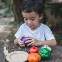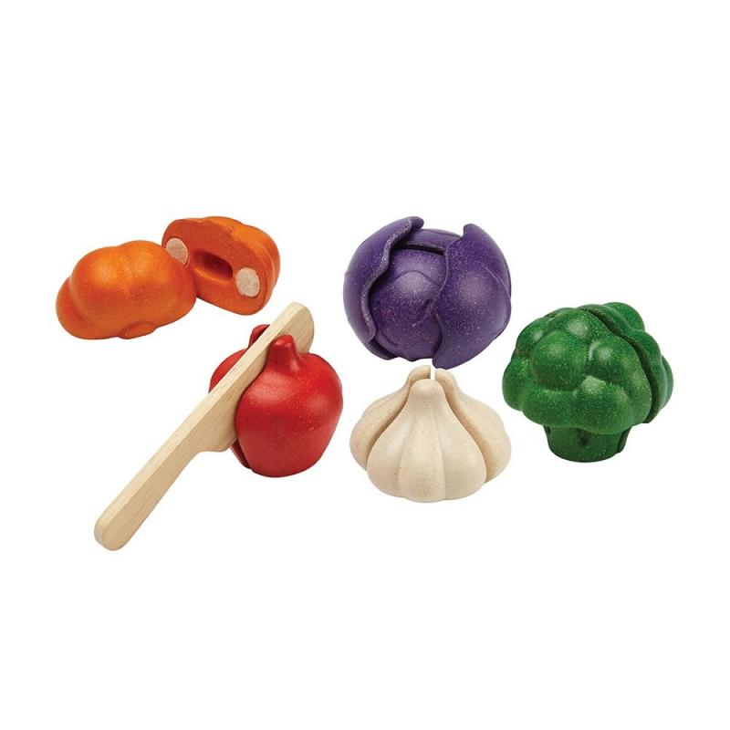 - 這世界如此多彩!孩子的餐盤應該也是如此!優質食慾的養成從扮家家酒的玩具就可以輕鬆開始。內含一把刀和五色的可切蔬菜:紫甘藍、綠花椰菜、紅甜椒,以及橘色的南瓜和白色的大蒜。