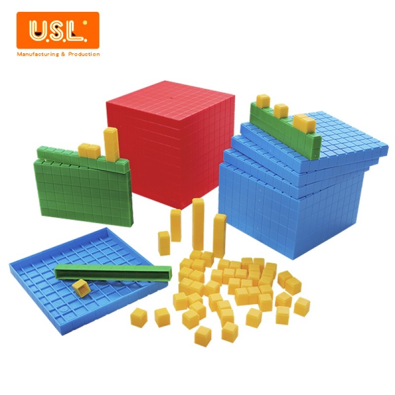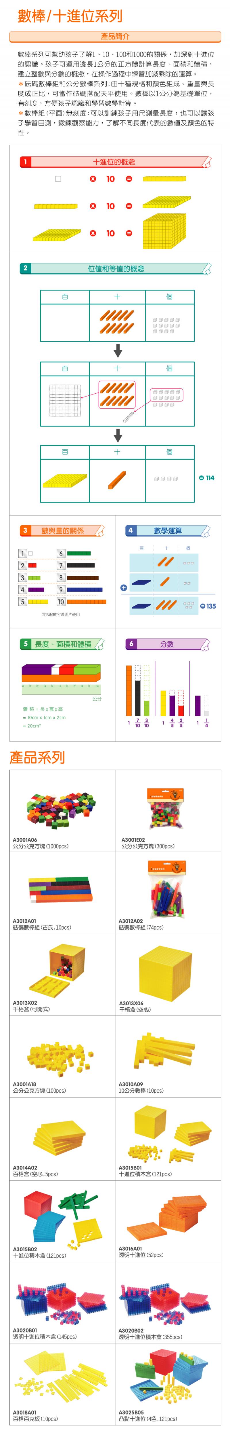- 數棒、百格板、千格盒上皆有1*1公分的格紋,讓孩子透過視覺和觸覺了解1.10.100和1000的關係,加深對十進位的認識。孩子也可運用邊長1公分的正方體來計算長度,面積、和體積,在操作過程中建立加減乘除的概念。