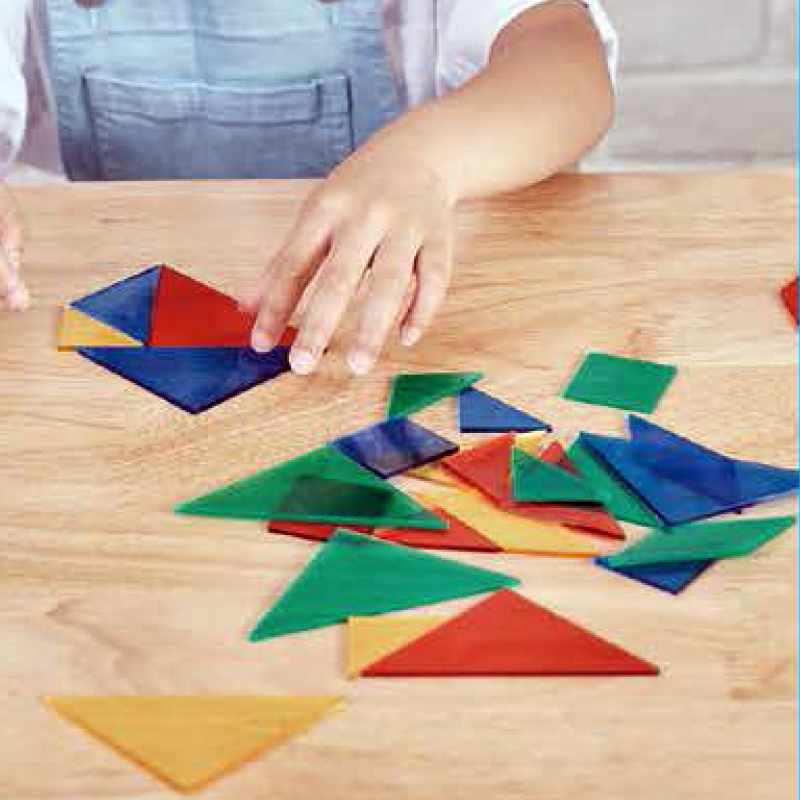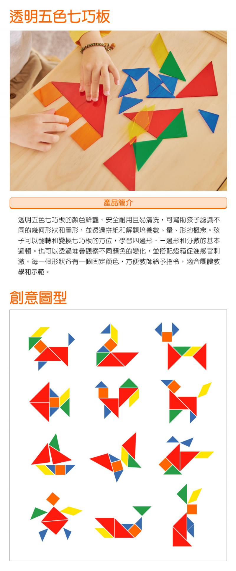 - 七巧板可以自由翻轉和變換位置,是老少咸宜的益智和藝術工具。孩子可以透過視覺和觸覺認識不同的幾何形狀和圖形,並透過拼組和解題培養數、量、形與空間概念。