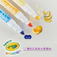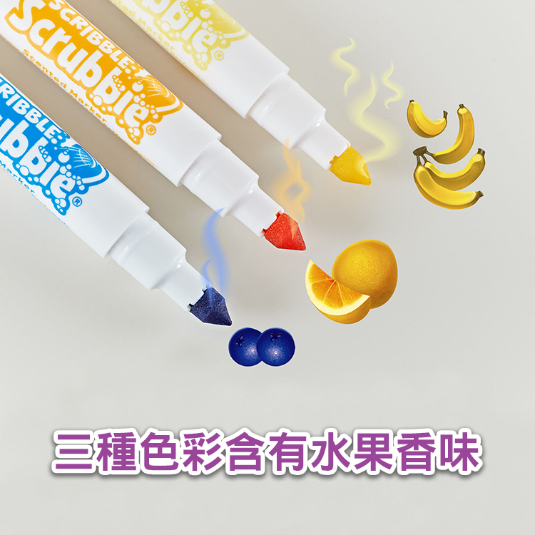 ●3隻彩色筆黃色、橘色、藍色有著不同的水果香味,分別是香蕉、柳橙和藍莓,彩繪過程也可以邊聞著水果的沁香,就像在自家的果園般