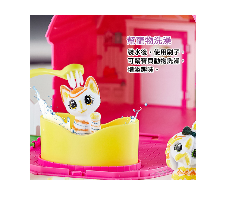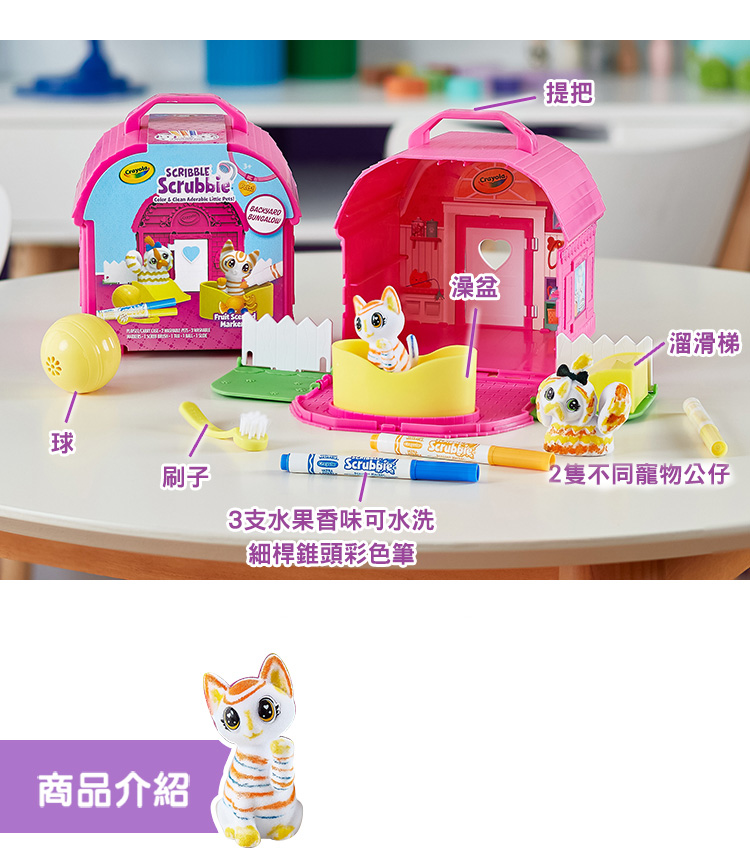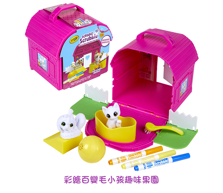 ●本產品【彩繪百變毛小孩趣味果園】內含2個寵物公仔、3支超強可水洗細短桿彩色筆、1支毛刷、1個浴缸、1顆球跟1個溜滑梯,提盒本身就是一個寵物的家的概念。可依照場景玩角色扮演