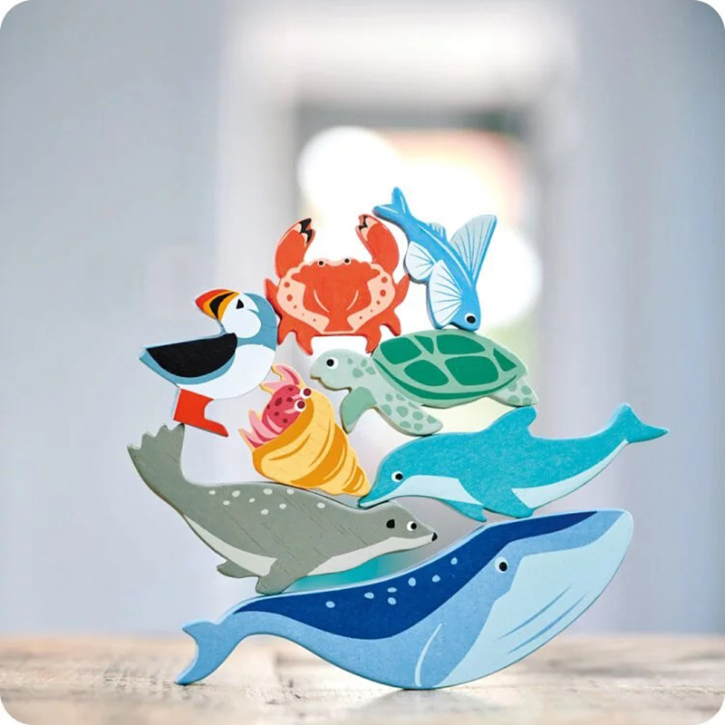 - 10種海洋生物積木(海龜,海豚,飛魚,海豹,海雀,寄居蟹,螃蟹,鯨魚,企鵝,海鷗)。認識海洋世界,原木打造的沿海生物,充滿童趣的圖形設計,讓孩子在遊戲中培養美學能力。透過8款動物積木,訓練小手肌肉和體驗平衡原理,是一款隨身攜帶的簡易耐玩遊戲。