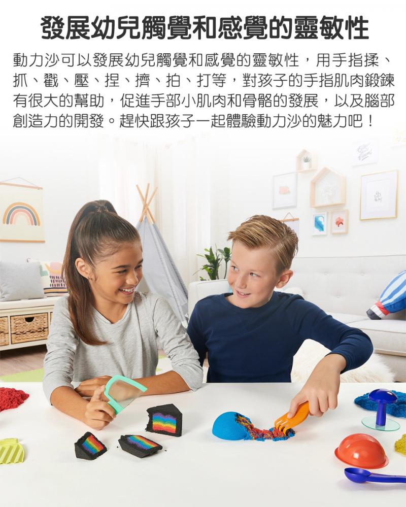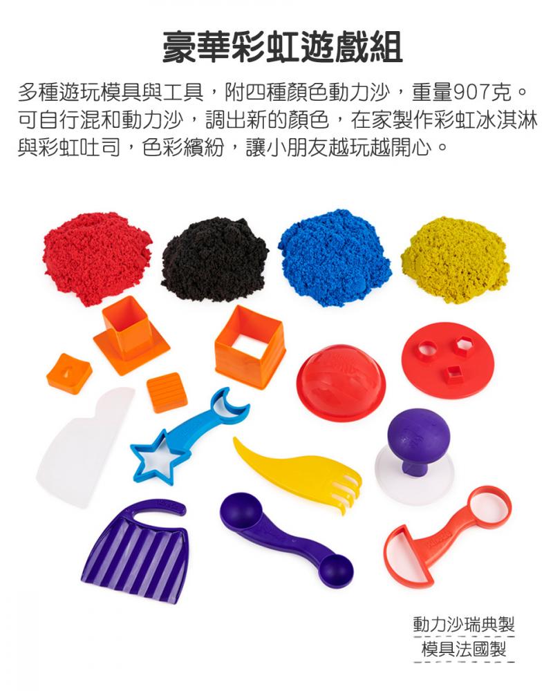 - 多種遊玩模具與工具,附四種顏色動力沙,重量907克。可自行混和動力沙,調出新的顏色,在家製作彩虹冰淇淋與彩虹吐司,色彩繽紛,讓小朋友越玩越開心。