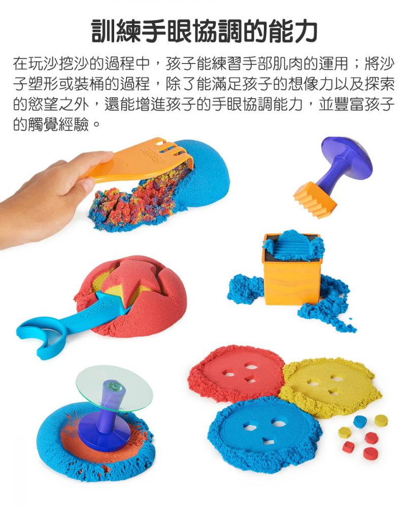 在玩沙挖沙的過程中,孩子能練習手部肌肉的運用;將沙子塑形或裝桶的過程,除了能滿足孩子的想像力以及探索的慾望之外,還能增進孩子的手眼協調能力,並豐富孩子的觸覺經驗。