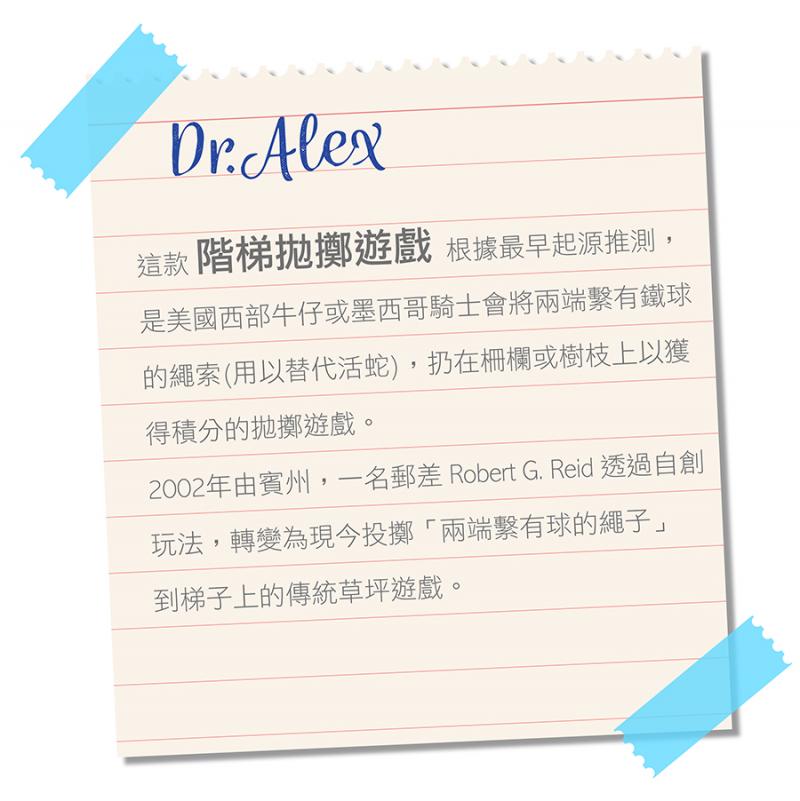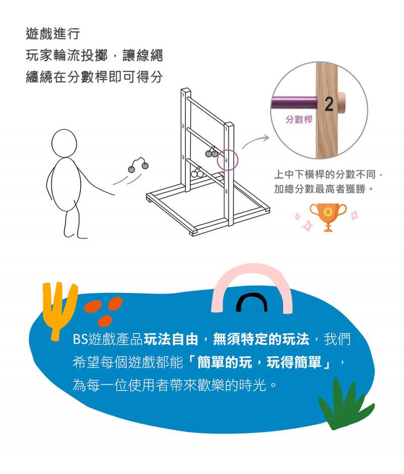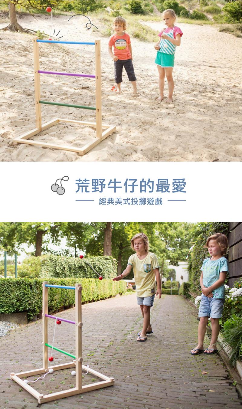- 這款遊戲發源於美國西部,是牛仔們常玩的一種投擲遊戲,後來成為家庭聚會、派對的戶外遊戲;玩家輪流投擲,讓拋擲球的線繩纏繞在橫桿即得分,上中下橫桿的分數不同,非常適合全家及三五好友同樂!它將帶給大家無限歡樂~