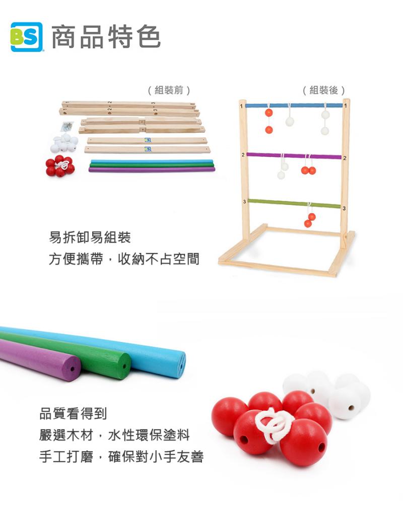 ● 內容物:拋擲球x6、橫桿x3、木條x6、螺絲釘x12、螺絲帽x6
