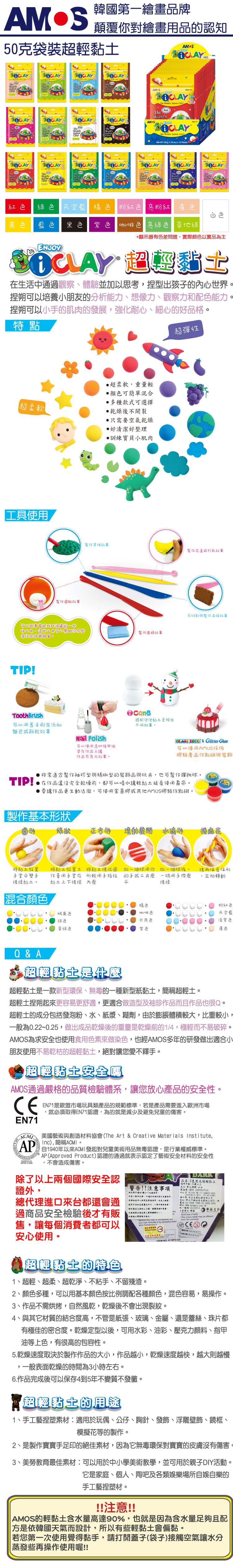 AMOS為求安全也使用食用色素來做染色,也經AMOS多年的研發做出適合小朋友使用不易乾枯的超輕黏士,絕對讓您愛不釋手。