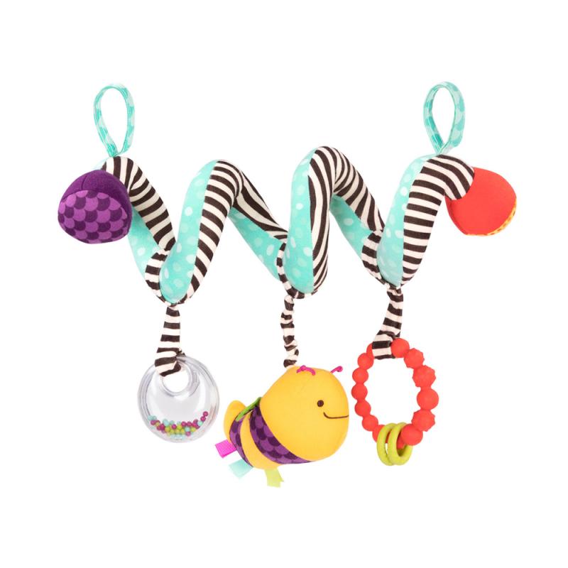 轉個圈圈隨處掛,小蜜蜂陪著我長大。玩具位置任意變換,保持新鮮感;多種花色滿足好奇眼神,伸手抓一抓,發展手部大小肌肉、視覺追視及手眼協調,豆豆沙鈴刺激聽覺,固齒器滿足冒出頭的小牙齒。