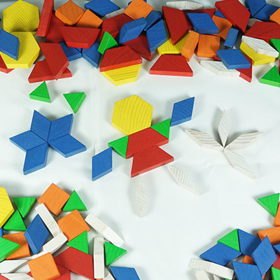 共有6 種幾何形狀、6 種顏色,每種積木都能互相連接成多種圖案。