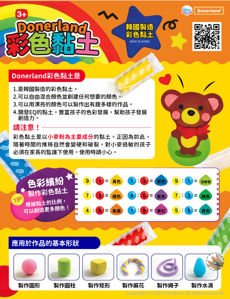- 彩色黏土是最廣泛使用也最受歡迎的教具,Donerland彩色黏土系列採純天然原料製作,以麵粉爲主要原料,完全無毒,讓大人放心,小朋友玩得開心,搭配各式各樣的模具做出專屬自己的黏土作品,培養小手的靈活力,也發展大腦的創造力。