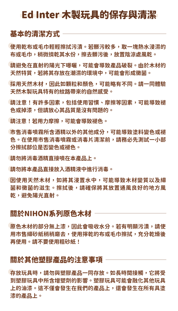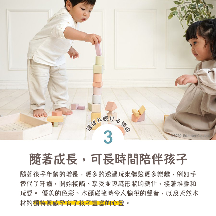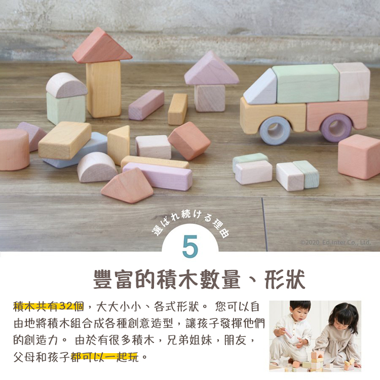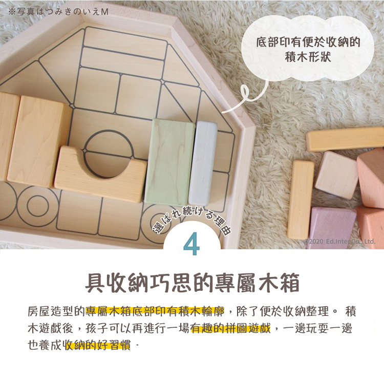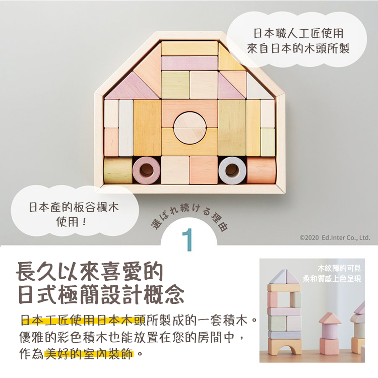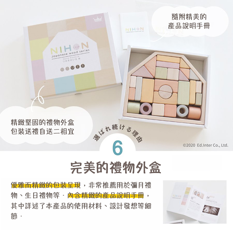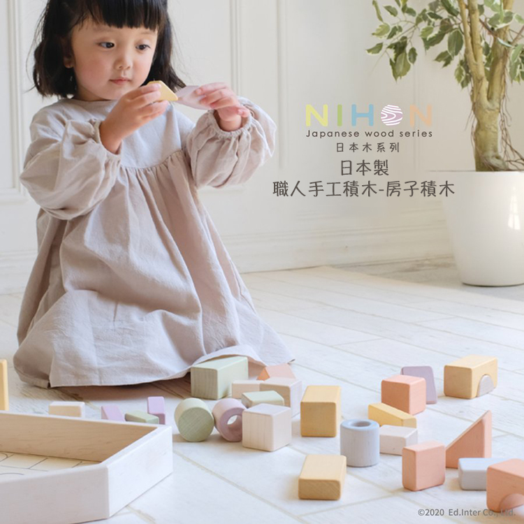 NIHON系列產品是由日本職人工匠使用日本原產木材所製成的一系列木製玩具。溫暖的木料和宜人的色調,精心雕刻的木頭上,再現了源自日本的柔和色彩。回歸到Ed inter品牌開創的起源,深入連結我們與顧客,到父母與孩子之間,再從孩子與孩子同儕之間,不斷透過聆聽幼兒教室老師們及家長們的意見,從認知、學習及互動性上不斷推陳出新,為兒童帶來從大自然而來的優良木製教育玩具,將木製玩具的優點和價值作為一個新的“日本高品質呈獻”向世界傳播。職人系列產品皆由日本工匠使用日本木材、日本漆料手工製作而成。在日本工匠精心雕刻的木頭上呈現出源自日本最高品質與溫暖柔和的色調。內含32個積木並配有房子形狀的收納木箱。