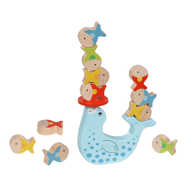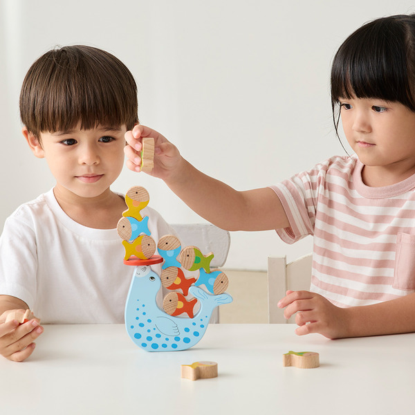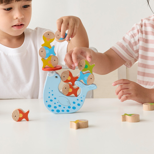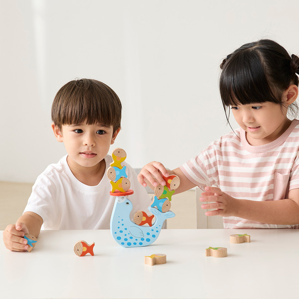 •將小魚依序堆疊在小小的紅色平台或海豹尾巴上,並取得兩端平衡。