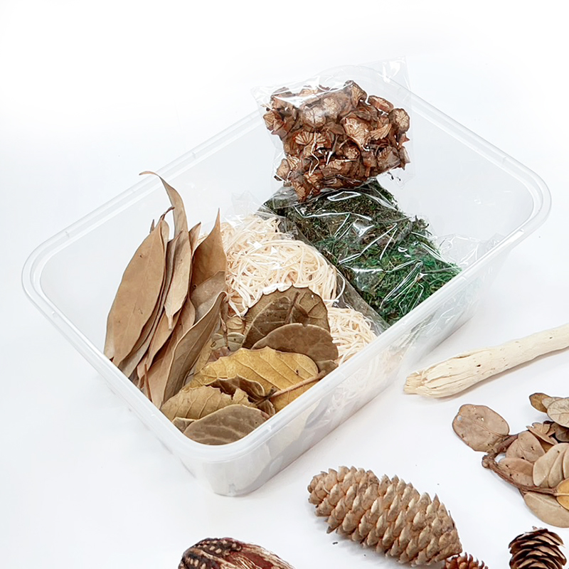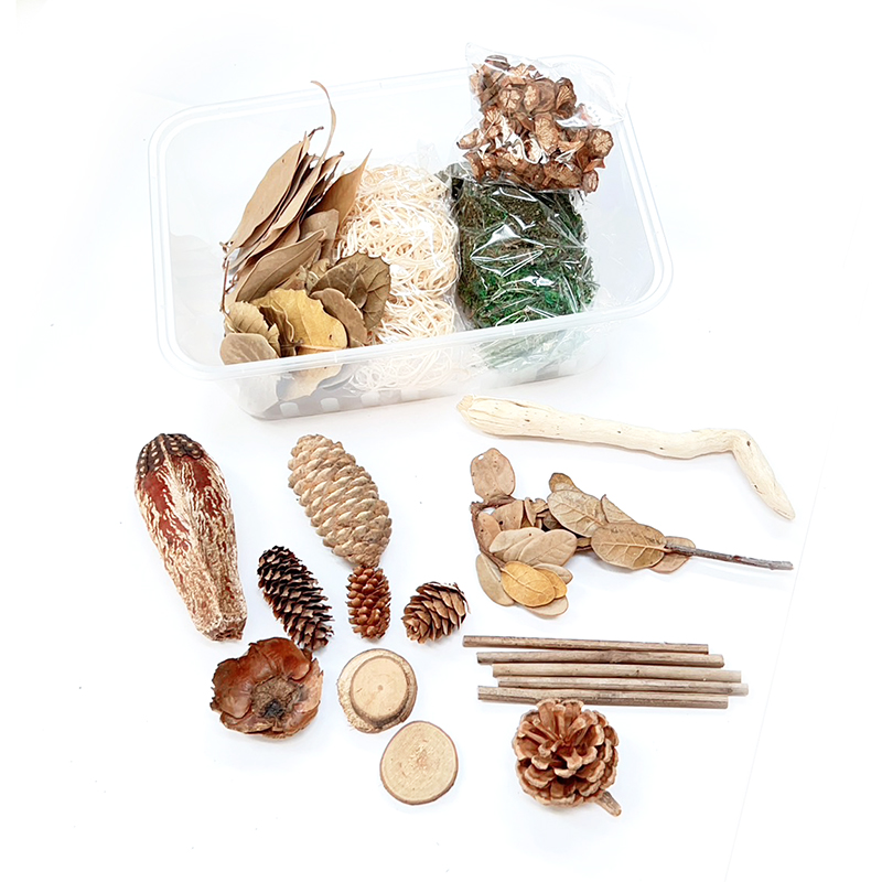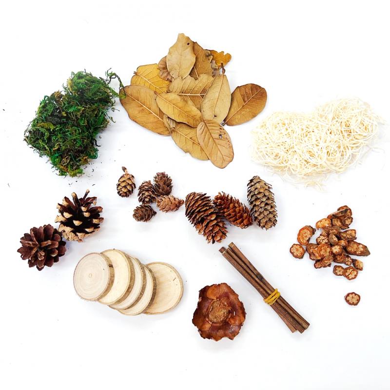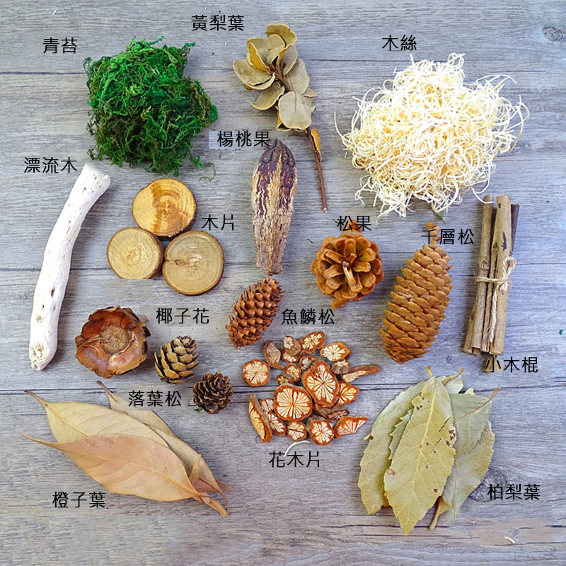 內容 : 青苔5g、黃梨葉*1、木絲5g、漂流木*1、楊桃果*1、松果*1、千層松*1、木片*3、椰子花*1、落葉松*1、花木片*10g、小木棍*5、柏梨葉5g、橙子葉5g