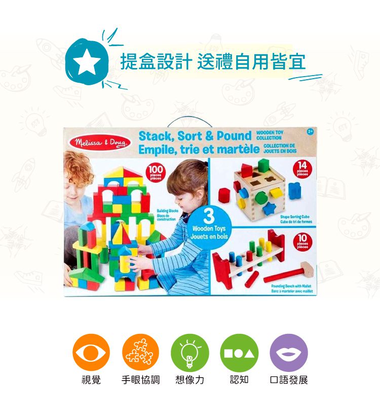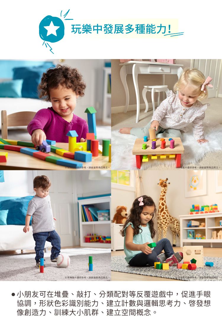 - 經典木製積木玩具可以鍛鍊手指和大腦。兩歲及以上的孩子會喜歡堆疊、建造、分類和錘擊,同時獲得寶貴的精細運動技能和靈活性、顏色和形狀識別以及數學預科技能的練習。