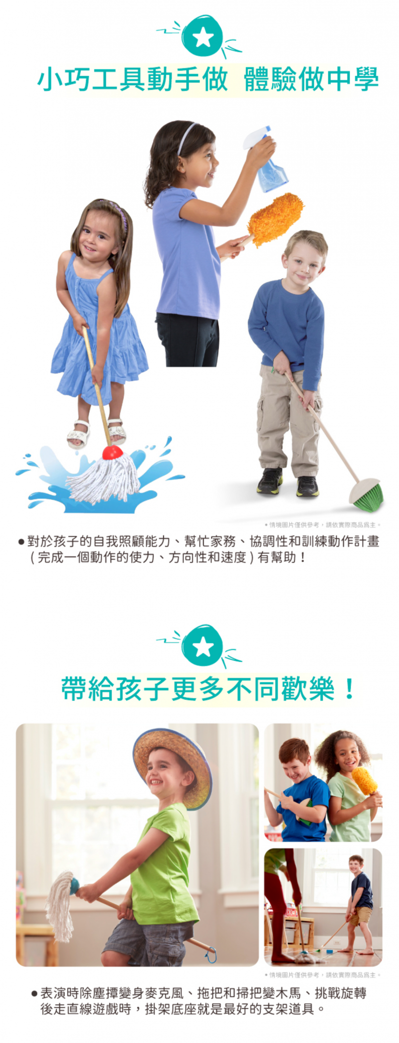 - 寶貝專屬的清潔洗衣組共有21個配件,掃帚、拖把、除塵毯、長刷子、熨斗、燙衣板…等,包含 3 種家事類型玩具:掃地組、洗衣組、清潔組,孩子的 3 種願望一次滿足!工具仿真等比例縮小,尺寸適合孩子小手抓握,採用木製手柄,堅固耐用,讓孩子放心遊戲,同時訓練自我照顧能力和肌肉發展!