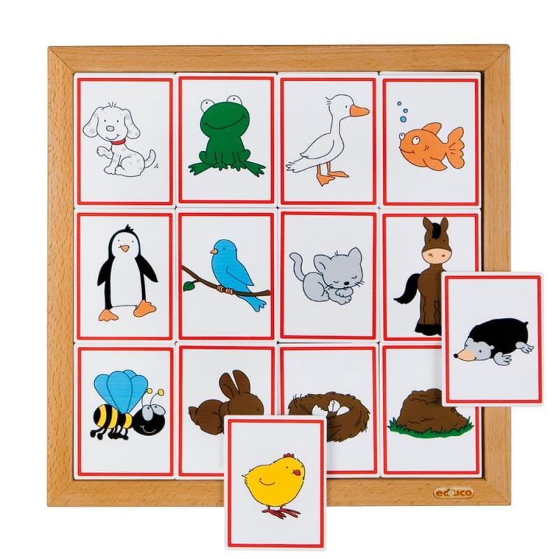 •9張動物圖卡與9張動物住家圖卡,於櫸木操作板上進行遊戲,激發孩子好奇心、想像力。