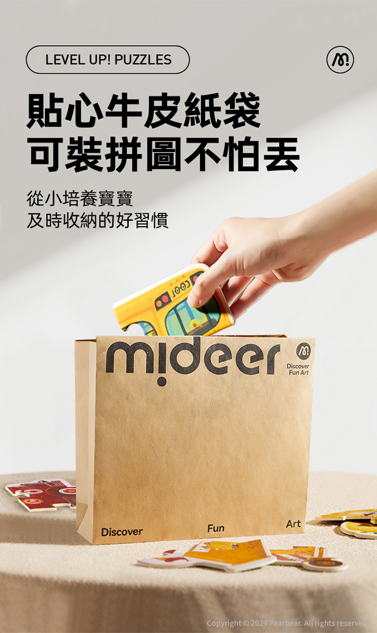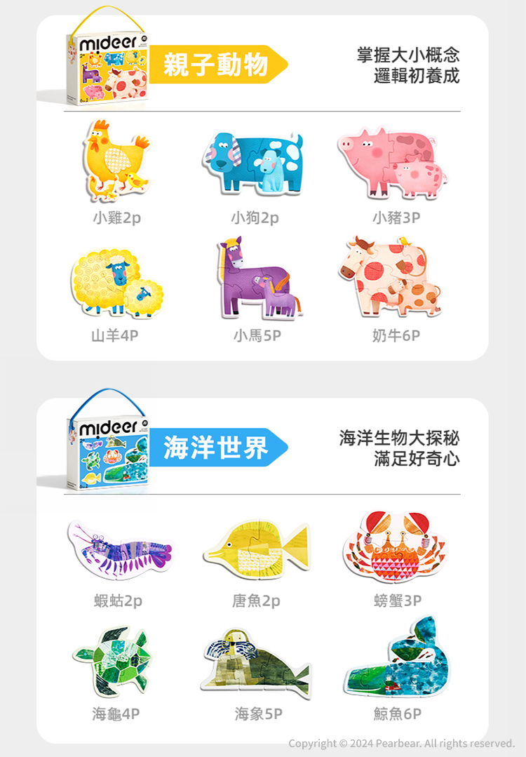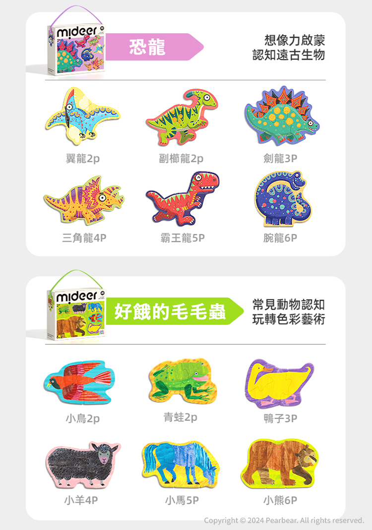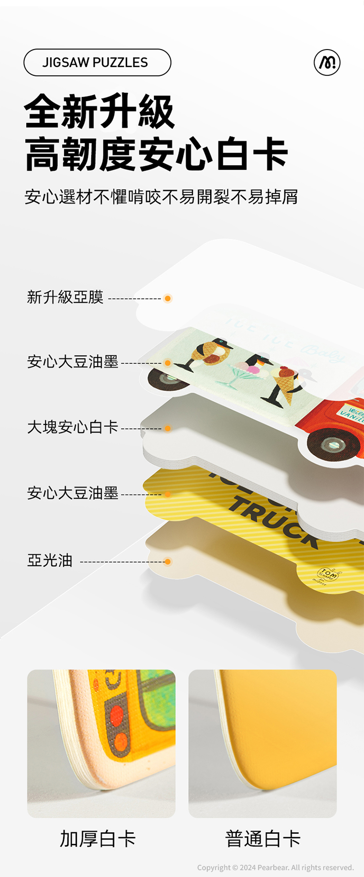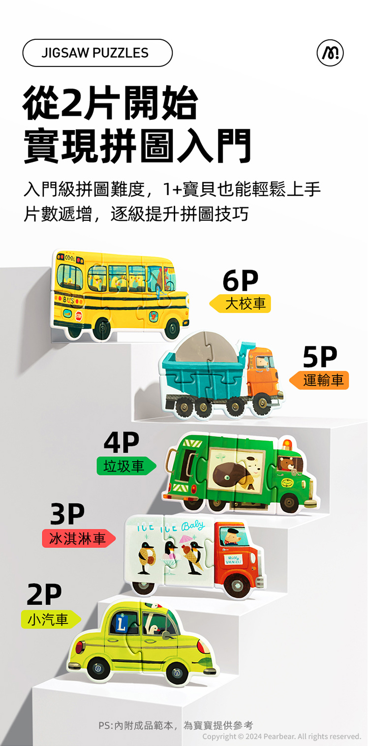 寶寶的第一套藝術啟蒙拼圖。世界藝術家共創多元美育啟蒙。全系列6大主題:汽車、工程車、恐龍、好餓的毛毛蟲、親子動物、海洋世界。寓教於樂漲知識。從2片開始實現拼圖入門。入門級拼圖難度,1+寶貝也能輕鬆上手。片數遞增,逐級提升拼圖技巧。大塊頭更好抓~加大尺寸,小手輕鬆抓握,好抓更好拼!6大能力提升,從小拼出藝術腦:審美力、邏輯力、空間思維、動手能力、藝術啟蒙、專注力。全新升級高韌度安心白卡,安心選材不懼啃咬不易開裂不易掉屑。每一個細節都用心,2.5mm加厚紙板耐折更耐玩。安心大豆油墨拒絕刺激性氣味。圓角一次成型無毛刺不傷手。手提禮盒包裝攜帶拿取都方便。可拎設計,隨走随拼,包裝大氣送禮也適宜。貼心牛皮紙袋可裝拼圖不怕丟。從小培養寶寶及時收納的好習慣。