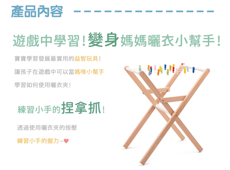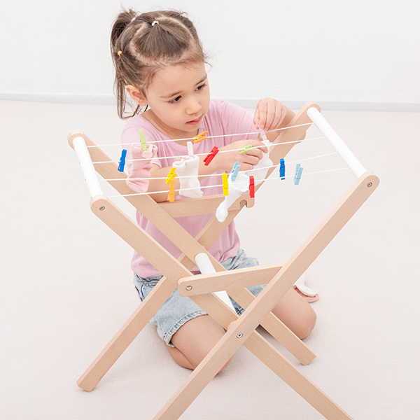它的設計簡單易懂,孩子們可以將自己的衣服夾在曬衣架上,就能學會如何曬衣服。