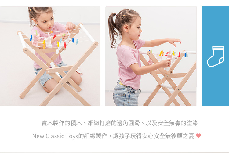 為了滿足孩子的好奇心及需求,New Classic Toys特別設計了這款木製兒童學習曬衣架。