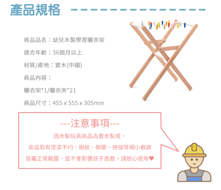 這款曬衣架是用高品質的天然木材製成,經過嚴格的安全測試,無毒無害,孩子能夠放心使用。