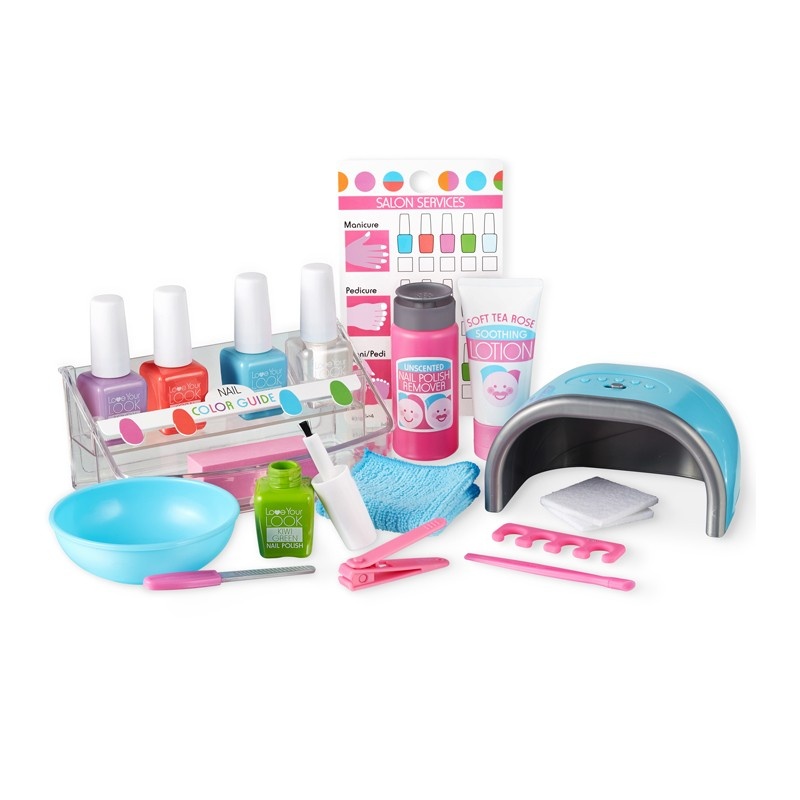 - 20個配件含指甲油瓶、銼刀 、碗、毛巾、指甲剪、腳趾擴張器、 帶LED 燈的光療機和活動卡。 進行假裝銼磨、修剪、清潔和拋光指甲、塗指甲油等扮演美甲和修 腳所需的一切。