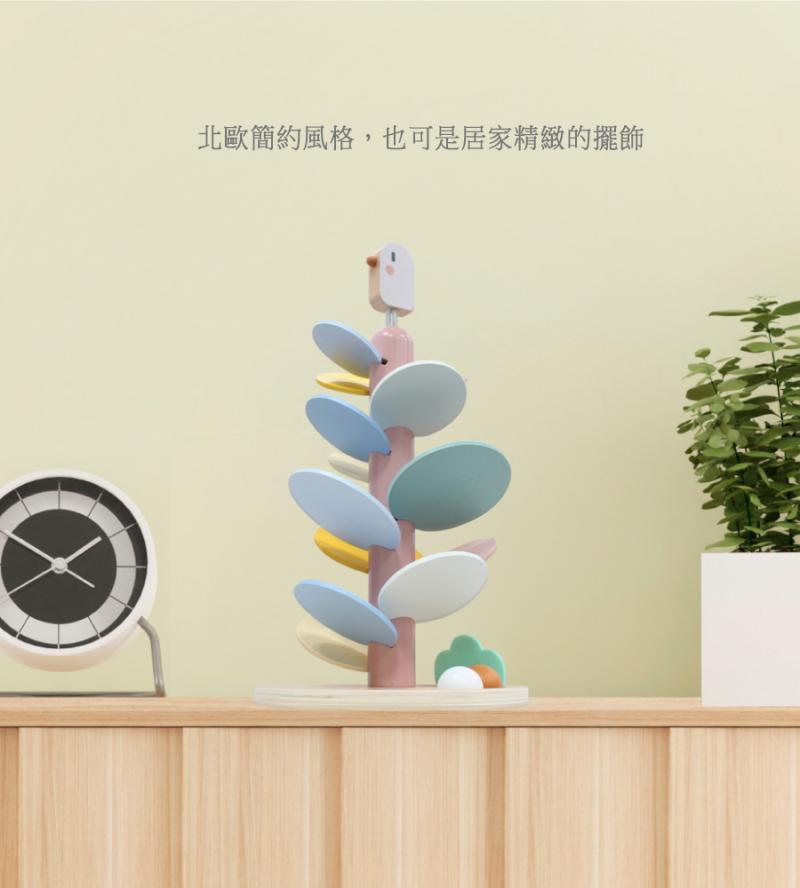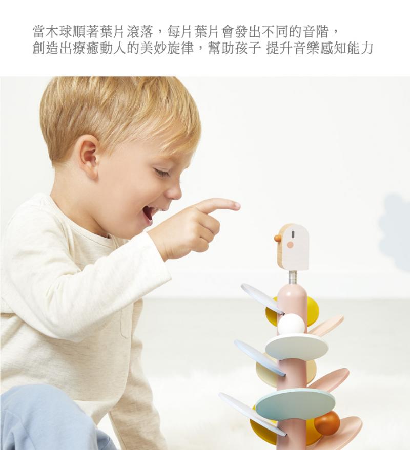 用14片大小與顏色不同的葉片打造出一顆繽紛的大樹,內附兩顆木球,當木球順著葉片滾落,每片葉片會發出不同的音階,營造出獨特美妙的旋律,帶來溫暖療癒的體驗。