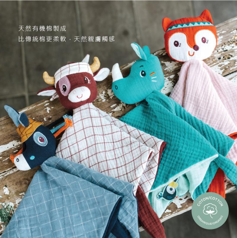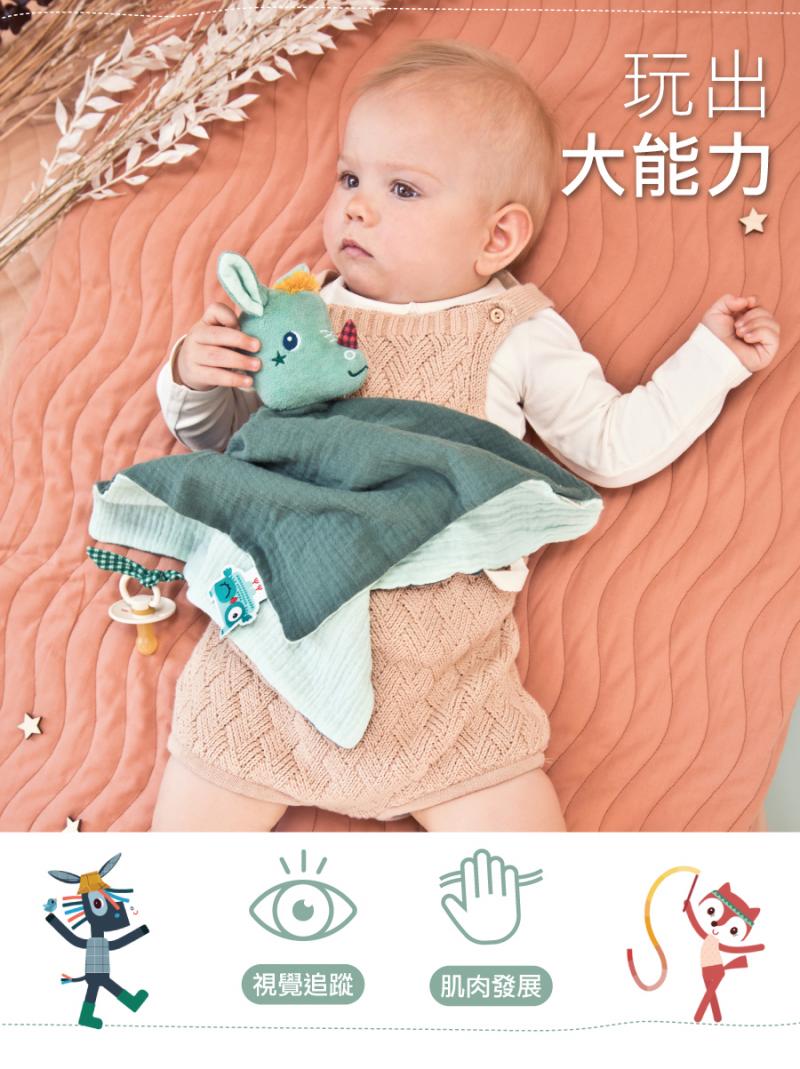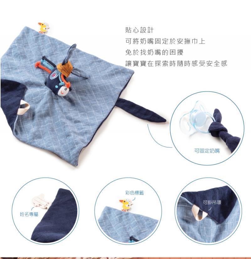 有機棉製成的安撫巾,一巾可多用,柔軟親膚,滿足寶寶安心感更好入睡,可愛的原創造型,一秒變身手偶,吸引寶寶注意,最棒的是能將奶嘴固定於安撫巾上,不會再為了找不到奶嘴而傷腦筋囉!