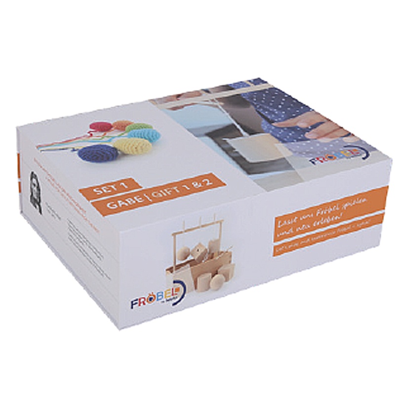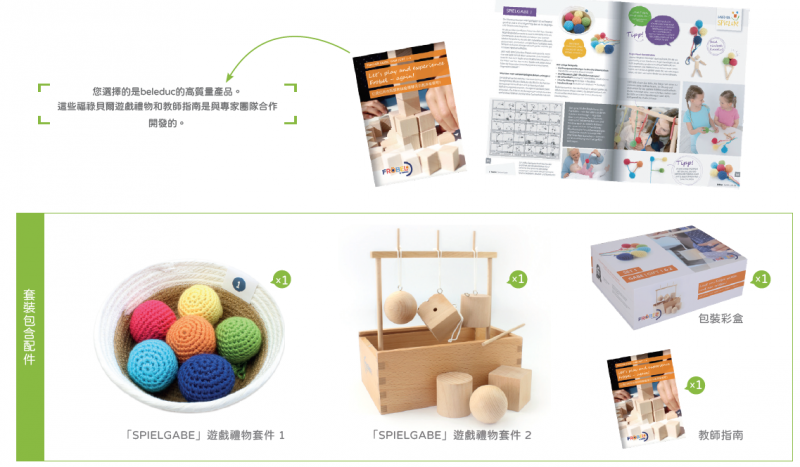 - 福祿貝爾認為,孩子的第一個玩具是球。於是有了「Spiclgabe」遊戲禮物套件1,即6個毛線球,球的運動性會喚起孩了的興趣。