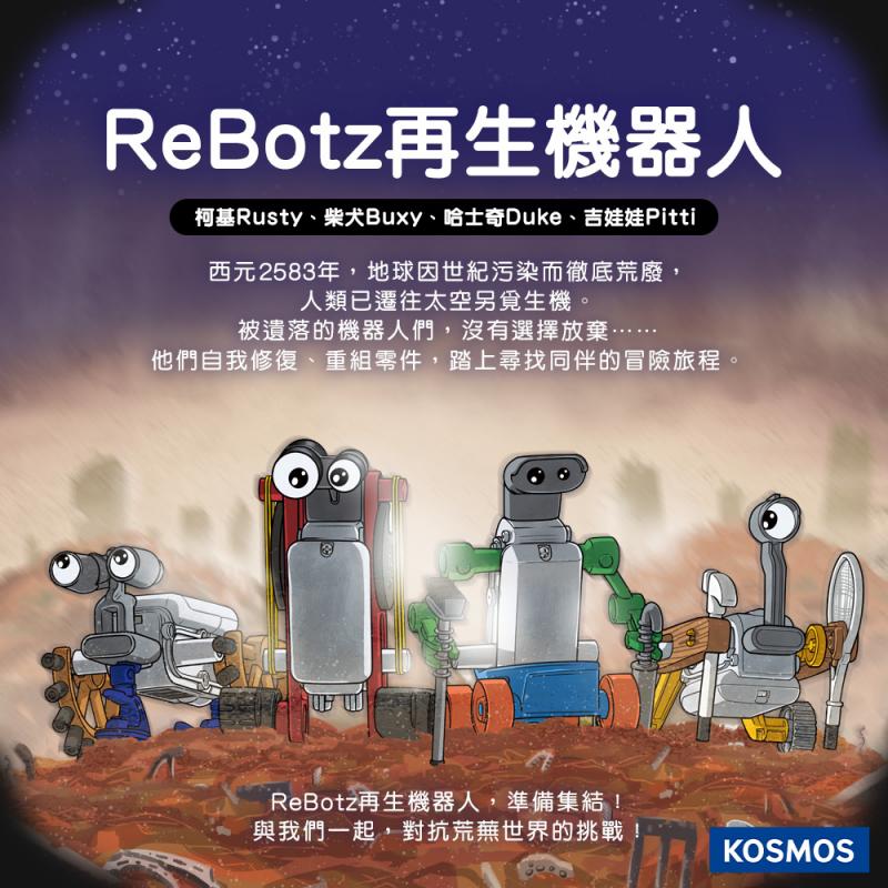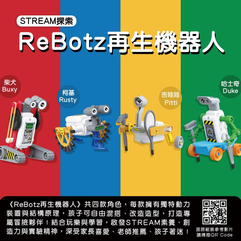 ReBotz 再生機器人系列共四款角色:哈士奇 Duke、柴犬 Buxy、柯基 Rusty、吉娃娃 Pitti。