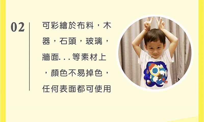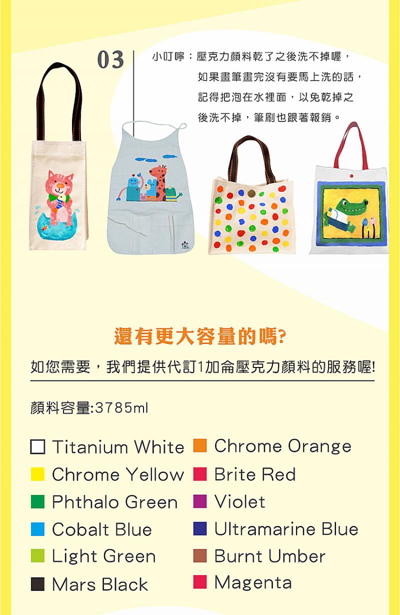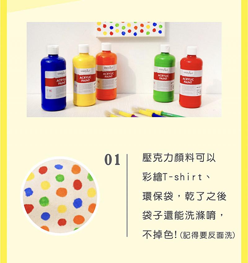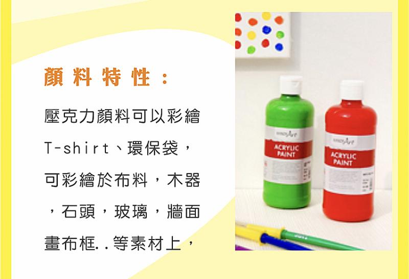 • 壓克力顏料可以彩繪T-shirt、環保袋,可彩繪於布料,木器,石頭,玻璃,牆面
