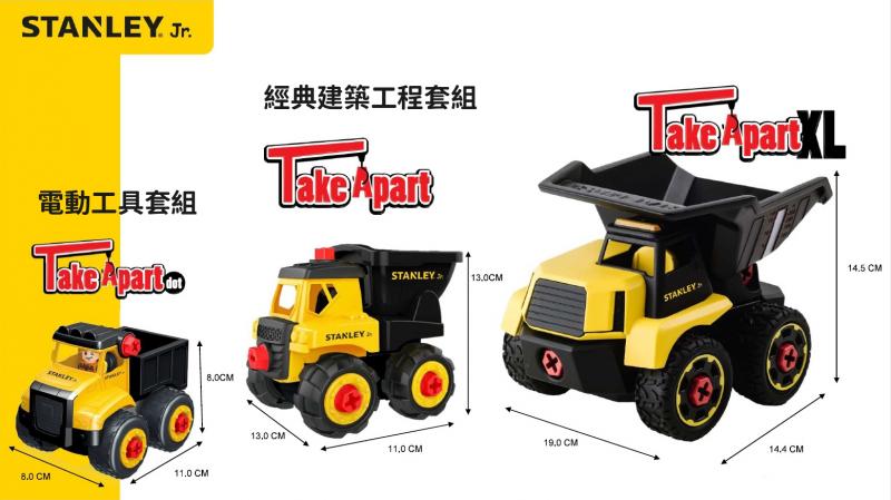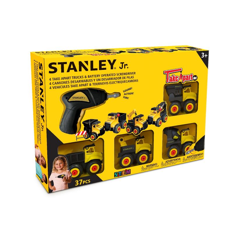 - STANLEY®Jr.的工程車系列“Take A Part”是為孩子所設計的高質感車輛,使他們可以在組裝和參與富有想像力的遊戲中度過美好的時光。電動工具套組,屬於更小型工程車,無人偶,組合所附的電動螺絲起子、螺絲相對更小。