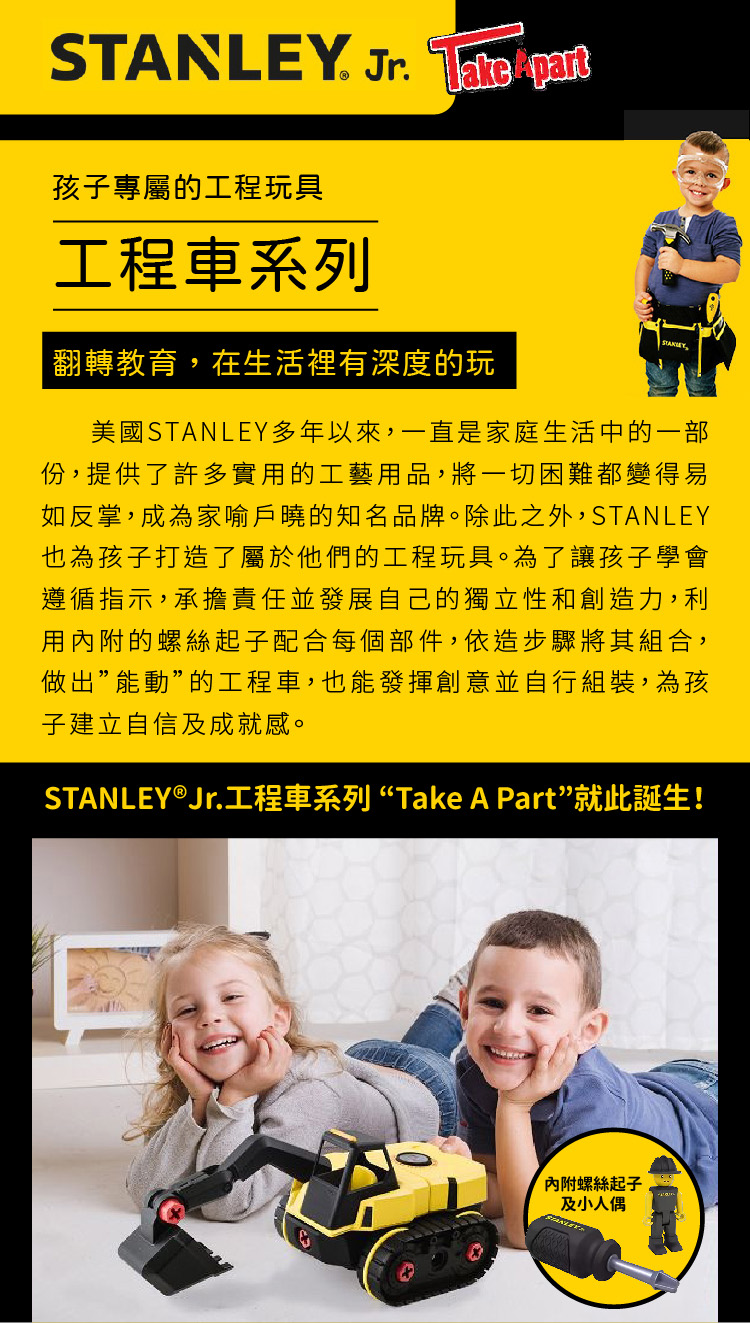 STANLEY®Jr.的工程車系列“Take A Part”是為孩子所設計的高質感車輛,使他們可以在組裝和參與富有想像力的遊戲中度過美好的時光。電動工具套組,屬於更小型工程車,無人偶,組合所附的電動螺絲起子、螺絲相對更小。