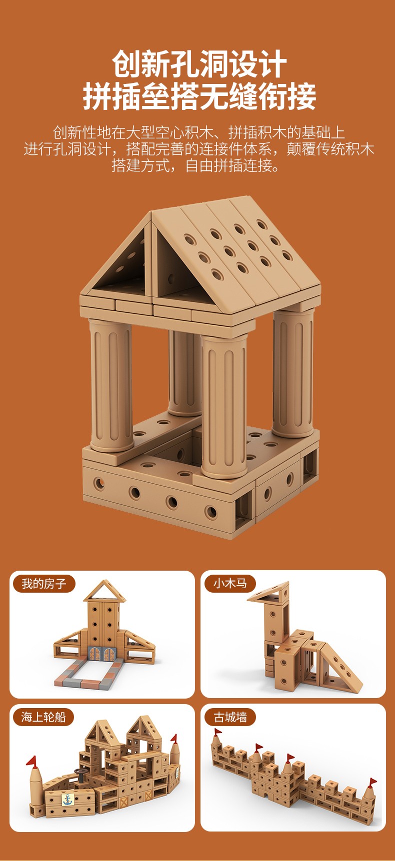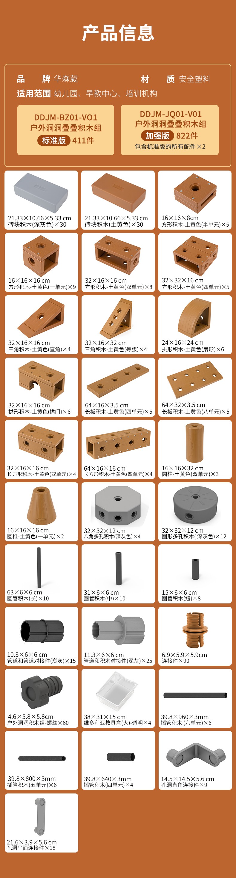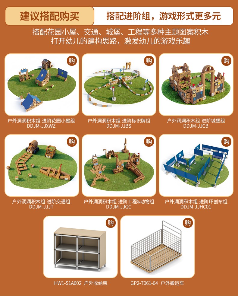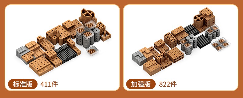 - 包含基礎積木、連接件積木、收納材料三大類型。積木程倍數關係,滿足任意拼插互搭,高度開放性設計,為幼兒探索空間結構,玩3D造型提供了無限的可能性。