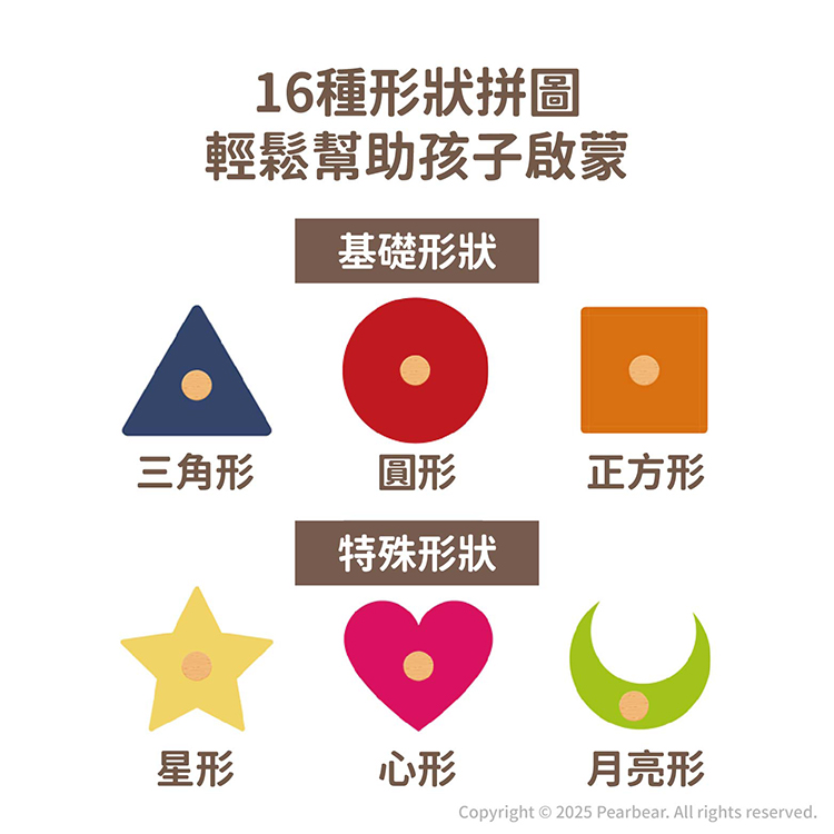 ・16種形狀拼圖搭配鮮明色彩,幫助孩子認識形狀並提升觀察力