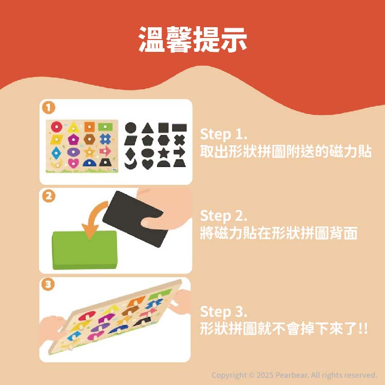 結合趣味與學習的益智玩具,透過色彩鮮明的形狀拼圖與磁力設計,幫助孩子在遊戲中提升手眼協調能力、觀察力及形狀認知。每一塊拼圖都配有特殊設計的大圓形手柄,方便孩子抓握,並訓練手部肌肉力量。此外,可購買英文配對認知遊戲卡-顏色形狀的學習卡片,讓孩子在遊戲中拓展詞彙量,輕鬆學習中充滿樂趣。磁力設計更貼心地解決了收納問題,避免散落或丟失,讓家長能輕鬆整理。無論是用於親子互動還是孩子自主探索,此手抓板都能激發創意,帶來無窮可能。木板的尺寸約為30x22公分。