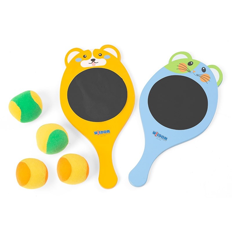- 一位幼兒手握粘球板,另一位手拿粘粘球相互投擲。粘球板下端長把手方便抓握。板中有可愛的雙面趣味魔術貼,只要碰到目標就能黏住。
