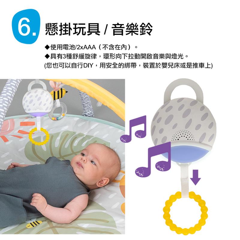 懸掛玩具-音樂鈴*1(不含電池):具有3種舒緩旋律,拉動拉環開啟音樂與燈光,也可裝在嬰兒床或推車上