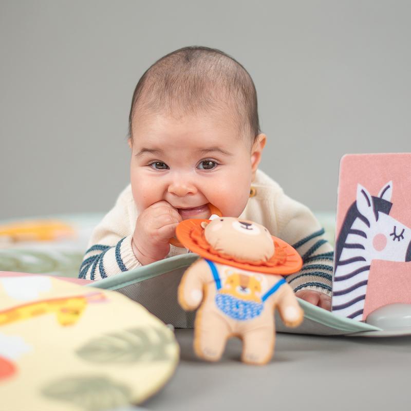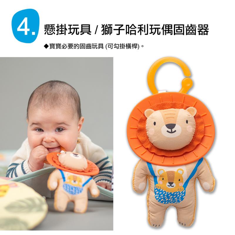 懸掛玩具-獅子玩偶固齒器*1:正反面不同材質,讓孩子觸摸有利於情感開發;固齒器可幫助舒緩、按摩牙齦,開發味覺功能